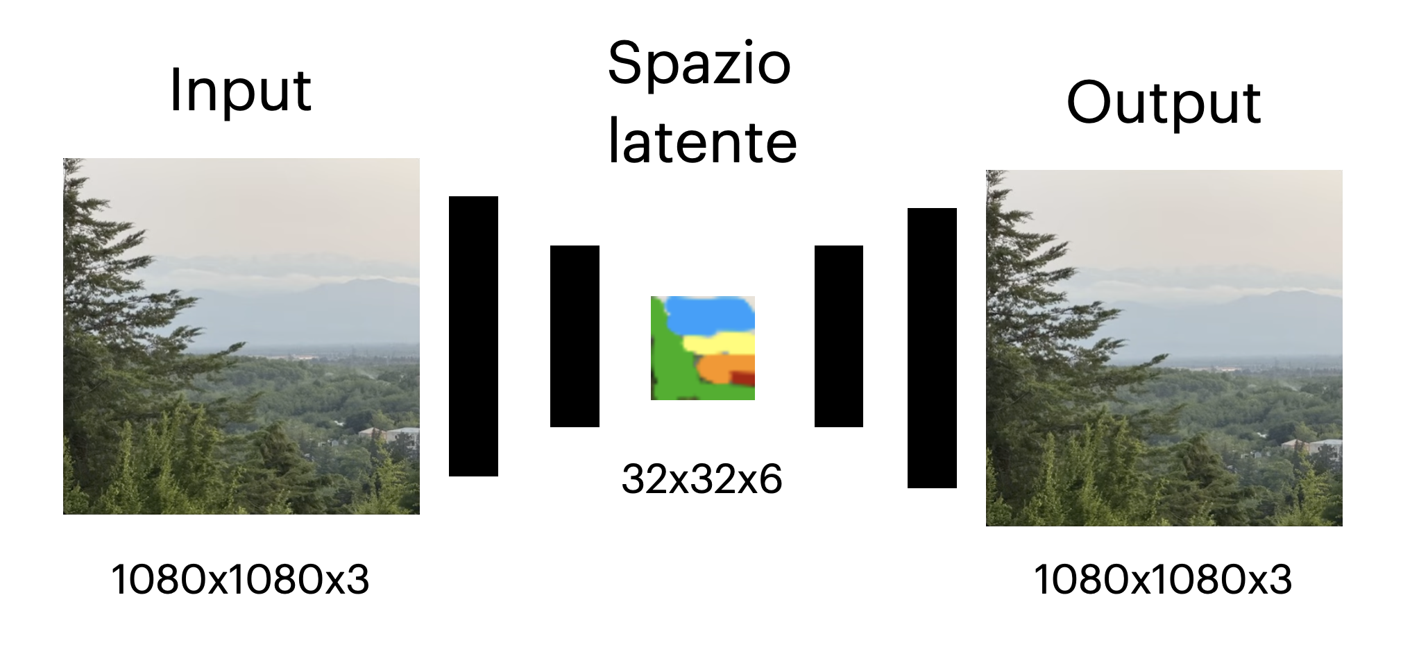 La caratteristica principale è che al centro della rete si trova uno strato intermedio molto più piccolo dei dati originali, chiamato spazio latente. Durante l’addestramento, l’autoencoder impara a comprimere l’immagine in questo spazio ridotto e poi a ricostruirla quasi perfettamente.