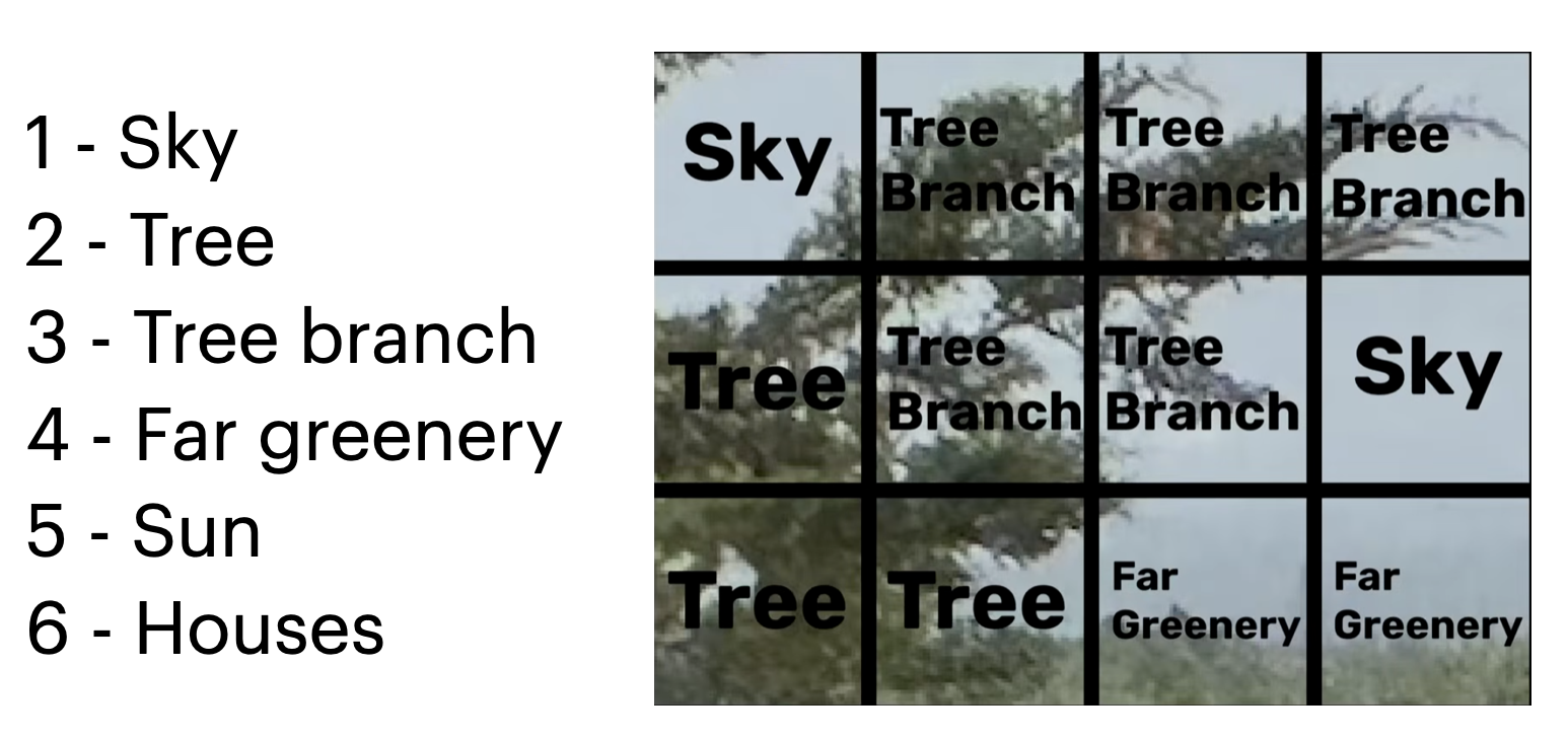 3. Ogni simbolo rappresenta concetti appresi dal modello (per esempio cielo, alberi o montagne) e può essere memorizzato come un piccolo numero intero, risparmiando moltissimi dati.