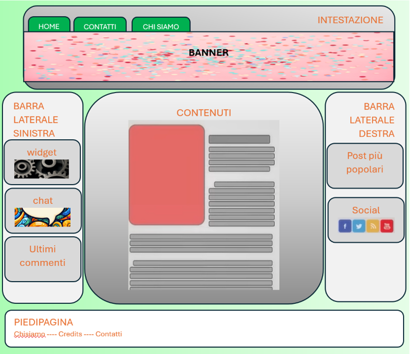 In figura (Immagine 1) vediamo che gli elementi presenti nella finestra di un blog possono essere: un’intestazione (la stessa per tutte le pagine) che comprende i link alle pagine che mostrano i contenuti “fissi” (home, contatti e chi siamo) e il banner, una sorta di immagine rappresentativa dei contenuti del blog.