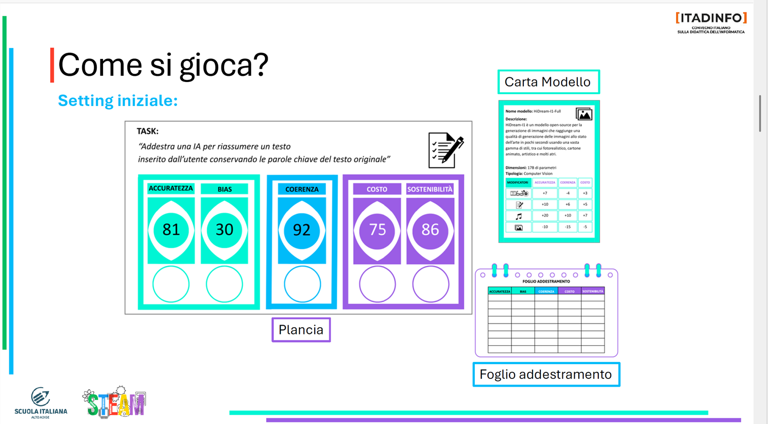 ci sono già tutti gli elementi per farsi un’idea del funzionamento del gioco, si tratta di un gioco di ruolo che impiega carte con diverse funzionalità, il giocatore mira a completare un obiettivo prestabilito (task) e, per farlo, ad ogni turno lancia un dado, pesca la carta associata alla faccia mostrata dal dado e aggiorna i parametri corrispondenti per addestrare il proprio modello.