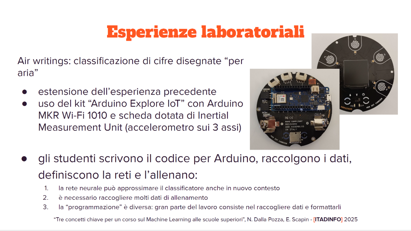 3. L’esperienza di laboratorio dell’addestramento di una macchina per distinguere numeri “disegnati nell’aria”, con l’ausilio di Arduino, che vorrei proprio replicare con i miei studenti e della quale vediamo qui sotto la slide relativa