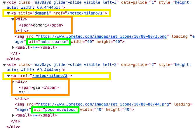 Fig.2Esaminando il codice HTML si osserva come il dato relativo ad un certo giorno inizia con il link href="/meteo/milano/N" (conNda 1 a 5) di un tag <a>, il giorno è descritto nel tag <div> seguente, e la previsione è sintetizzata nell’attributo alt del tag <img> successivo.