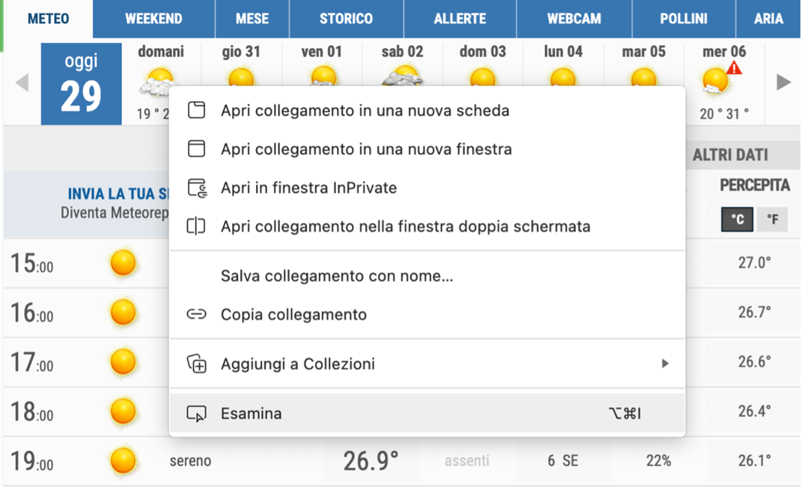 Apriamo la pagina https://www.meteo.it/meteo/milano, clicchiamo col tasto destro del mouse sull’icona della previsione generale per “domani” e apriamo l’analizzatore dal menu contestuale (su Chrome è la voce Esamina).
